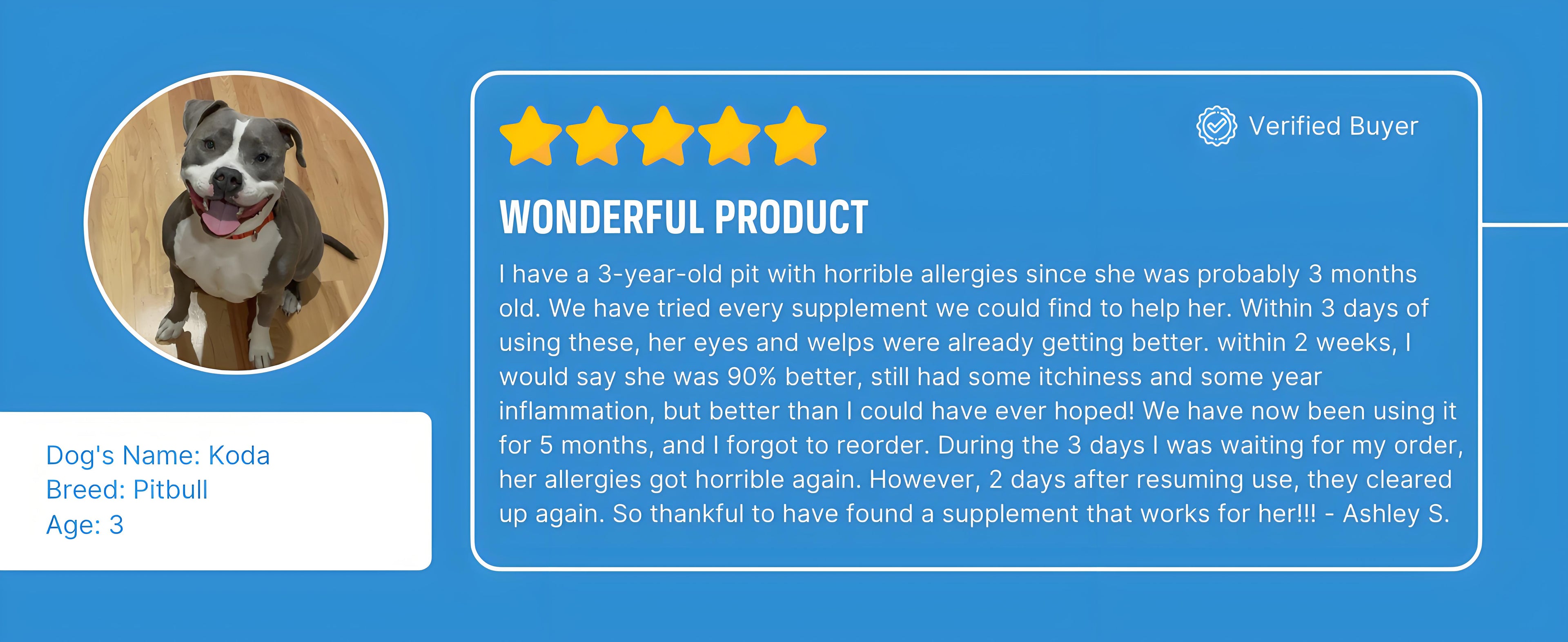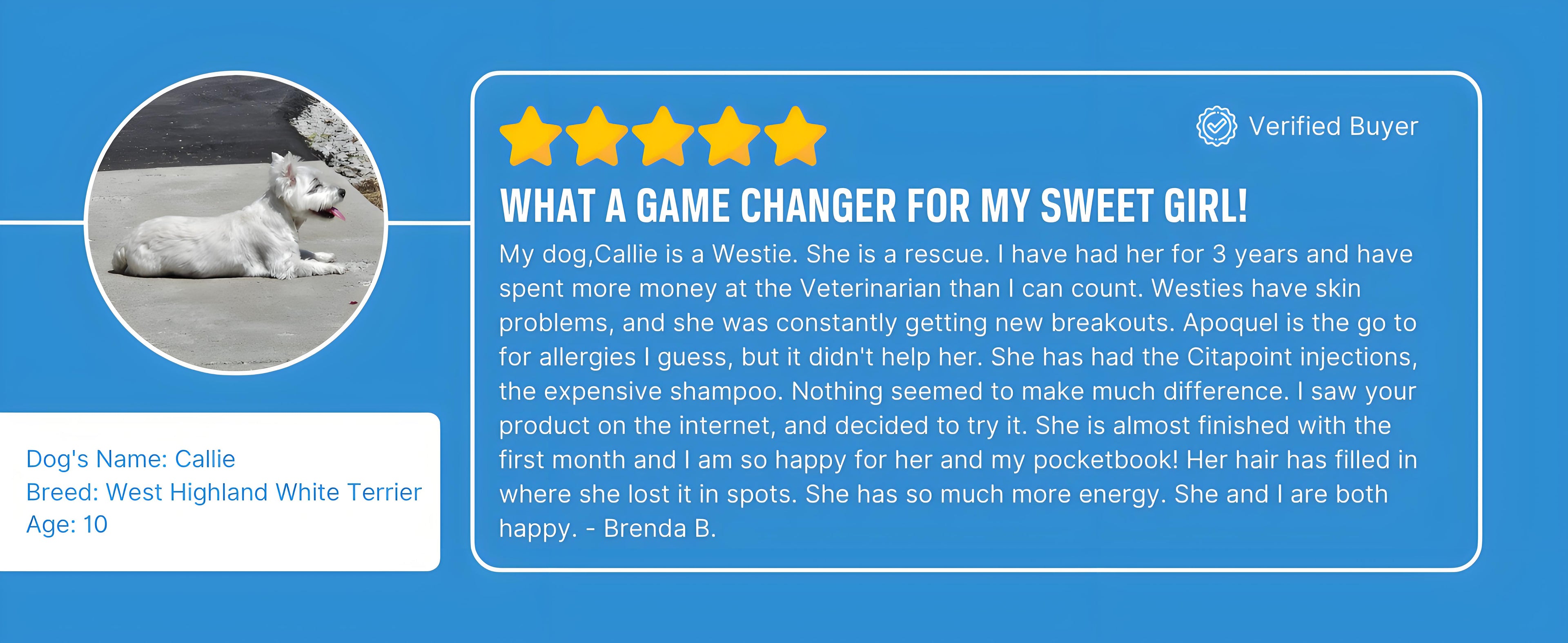 "My dog had allergies like crazy and I tried everything. Thousands in vet bills to try to figure out how to stop it. I was going broke and was tired of getting no results. So I see your ad and decide to try it. Amazing results within days. She is now break out free.